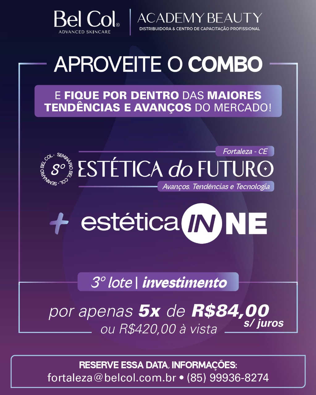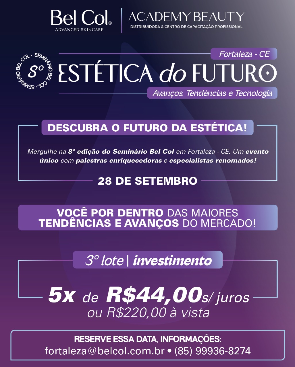 A 8ª edição do Semiárido Bel Col – Estética do Futuro será uma imersão completa em inovação, ciência e resultados reais. O evento trará palestras de alto nÃvel com grandes nomes da saúde e da estética, conteúdo cientÃfico atualizado e fundamentado em evidências, tecnologia de ponta aplicada aos tratamentos estéticos e protocolos inovadores, eficazes e respaldados pela prática clÃnica. Haverá também sorteios exclusivos para os participantes, amplo espaço para networking e muito mais.